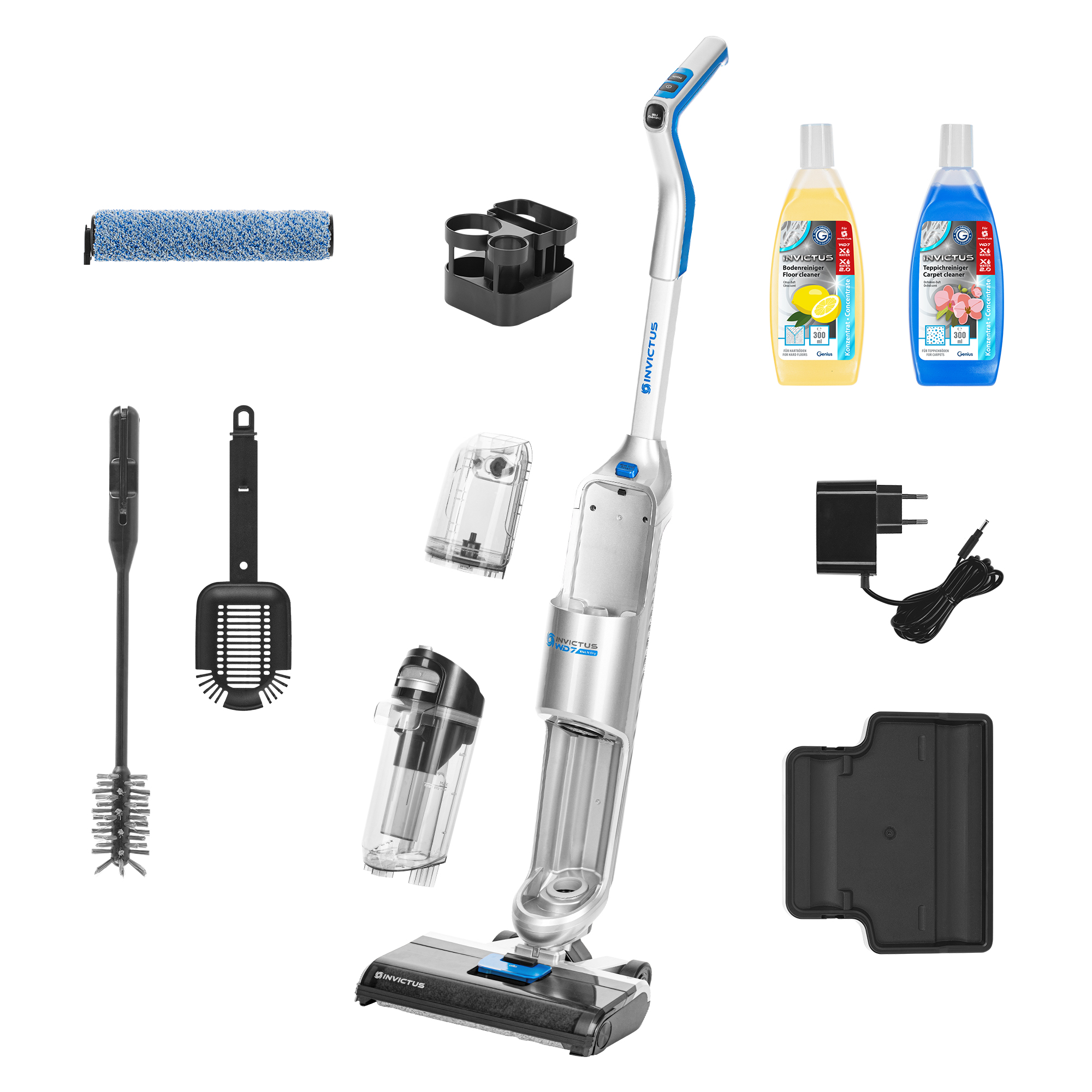 Für eine ordentliche Reinigung Ihrer Böden brauchen Sie neben dem INVICTUS WD7 zusätzlich auch das richtige Reiniger-Konzentrat. Im 17-teiligen Deluxe-Set sind gleich zwei davon vorhanden: das INVICTUS Bodenreiniger Konzentrat und das INVICTUS Teppichreiniger Konzentrat. Mit dem Bodenreiniger Konzentrat entfernen Sie Verschmutzungen und Gerüche auf allen Arten von Böden. Verwenden Sie es ganz einfach auf Hartböden, Hartholzböden, Fliesen, Laminat und sogar auf Teppichböden. Es hinterlässt nahezu streifenfreie Sauberkeit und einen herrlichen Zitronen-Duft. Das Teppichreiniger Konzentrat dagegen eignet sich für alle Arten von Teppichböden. Es dringt tief in die Teppichfasern ein, frischt sie wieder auf und verleiht ihnen einen zarten Orchideen-Duft. Beide Konzentrate punkten aber nicht nur durch ihre hohe Effizienz bei der Sauberkeit. Sie sind beide auch vegan, bieten Ihnen eine umweltfreundliche Reinigungslösung und sind bedenkenlos anzuwenden in der Umgebung von Kindern und Haustieren.