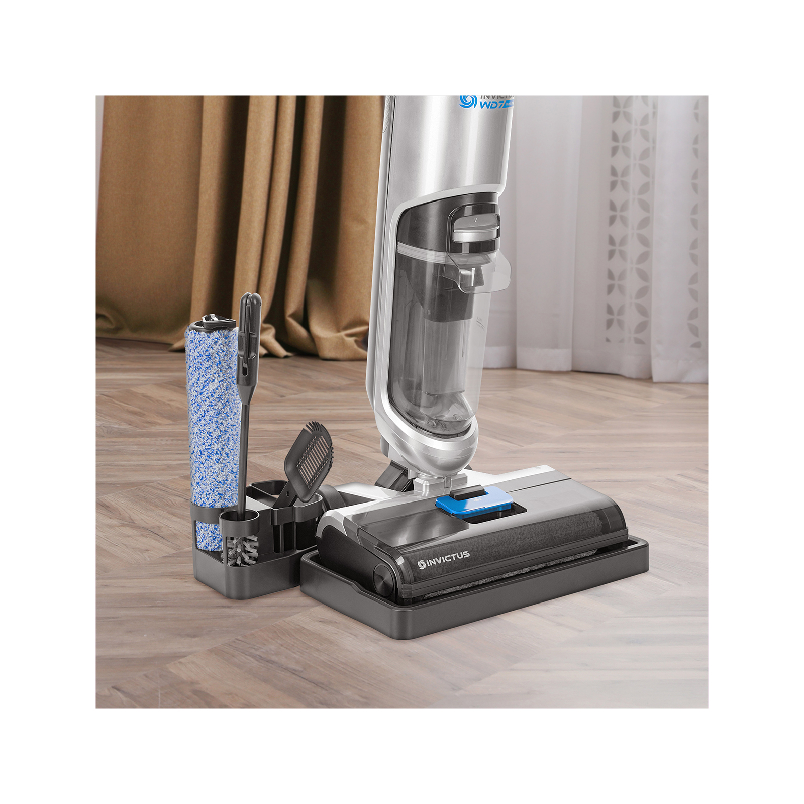 Der INVICTUS WD7 bereitet Ihnen in jeder Situation eine effiziente und einfache Reinigung. Genießen Sie einen uneingeschränkten Aktionsradius durch die kabellose Verwendungsweise und lassen Sie sich während der Reinigung nicht stressen: Der leistungsfähige Lithium-Ionen-Akku mit 2.500 mAh sorgt für 35 Minuten Höchstleistung, sodass Sie in Ruhe alle Böden reinigen können. Mit dem leistungsfähigen Nass- und Trockensauger von Genius können Sie bis zu 250 m² säubern. Die Reinigung ist also flächendeckend gründlich im ganzen Haus. Klingelt das Telefon, während Sie saubermachen? Begeben Sie sich nicht gestresst auf die Suche nach einem geeigneten Ort, an dem der Nass- und Trockensauger sicher stehen kann. Der INVICTUS WD7 steht von selbst – und das überall, sodass die Reinigung noch bequemer für Sie wird. Und nach dem Gespräch am Telefon kann die Reinigung in Höchstform dann weitergehen. Die leistungsstarke motorisierte Elektrobürste kommt dabei auf eine Rotationsgeschwindigkeit von ganzen 2.000 RPM, sodass Staub, Schmutz und Haare keine Chance haben. Im vorteilhaften 17-teiligen Deluxe-Set erhalten Sie neben der motorisierten Elektrobürste auch noch eine Teppich-Bürstenrolle. Diese sorgt mit ihren Borsten für eine optimale Reinigung von Kurzflor-Teppichen. So können Sie alle Arten von Hartböden und Kurzflor-Teppiche auf ideale Weise säubern. Aber nicht nur die Bürsten sorgen für die kraftvolle Reinigung. Der innovative Nass- und Trockenreiniger bietet ebenfalls ein Zwei-Tank-System für einen konstanten Fluss von sauberem Wasser. So wird nur Frischwasser für das Wischen des Bodens benutzt und das Schmutzwasser findet Platz in einem separaten Wassertank. Der Frischwassertank bietet Platz für 600 ml Wasser und der Schmutzwassertank für 400 ml. Beide sind leicht abnehmbar und mühelos zu reinigen. Das Deluxe-Set bietet Ihnen dafür eine Reinigungsbürste und einen Reinigungskamm, mit denen Sie die Wassertanks auf einfachste Weise säubern können. Freuen Sie sich zusätzlich auf einen leisen Betrieb: Der INVICTUS WD7 arbeitet ohne laute Geräusche: Saugen und wischen Sie beruhigt in der Nähe von Kindern und Haustieren – der Motor ist leise, sodass es zu keinem Lärm kommt. Wenn Sie die Reinigung abgeschlossen haben, können Sie den INVICTUS WD7 einfach in der praktischen Aufbewahrungs- und Reinigungsstation abstellen. Mit dieser verstauen Sie den Hochleistungs-Sauger immer ordentlich und kompakt.
